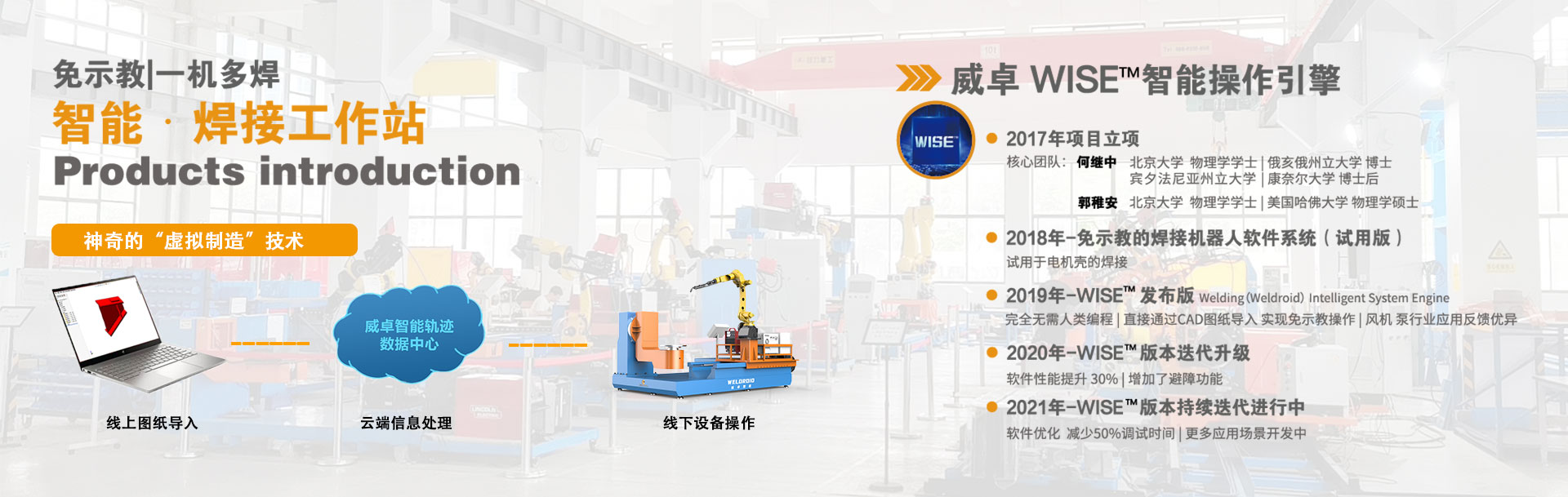 無錫威卓智能機器人有限公司成立于2017年,是無錫市政府引進的科技領軍型高新技術企業,公司研發團隊80余人,我們堅持自主創新,利用自主開發的虛擬制造技術對傳統焊接行業進行升級改造。 公司主推的工業風機系列-智能焊接工作站產品,具有免示教、實時跟蹤、簡易工裝、傻瓜式操作等優點,真正幫助企業解決了招焊工難,用工成本高,焊接質量不穩定等問題。